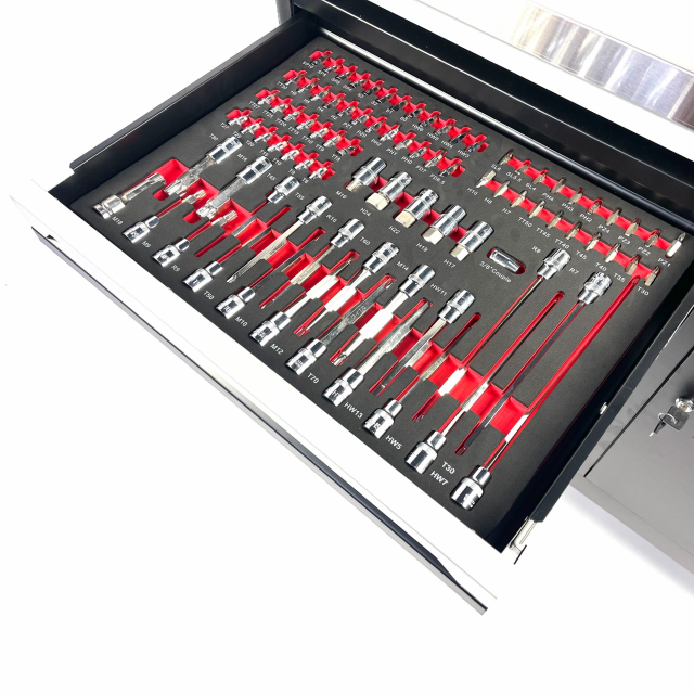 In deze  gereedschapswagen vindt u een uitgebreid 295-delig gereedschapset met onder andere een compleet doppenset met ratels in drie verschillende opnames: 1/2″, 1/4″ en 3/8″. De schroevendraaiers in deze gereedschapswagen zijn van professionele kwaliteit en op de kop voorzien van een zeskant voor extra kracht te zetten met een sleutel of hamer.